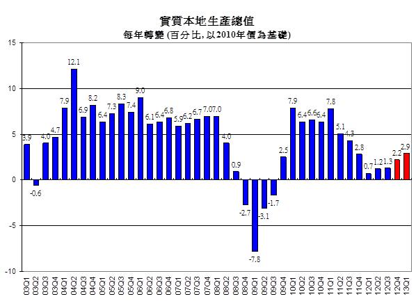 儘管面對各種不利因素,包括歐洲債務危機不明朗、美國經濟復甦乏力和中國經濟增長放緩,香港實質本地生產總值在2012年仍錄得1.3%的增長,而2011年則為4.9%。