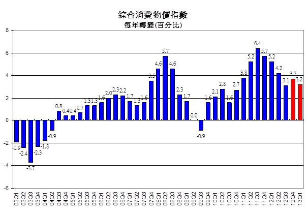 - 以綜合消費物價指數按年變化的百份比計算,2012年11月一般價格水平上升了3.7%,食物與私人住宅租金分別佔整體增幅的1.2和1.7個百分點。整體通脹率在2012年第四季增加3.7%,全年增加4.1%。由於食品價格上漲放緩,相對穩定的資產價格和較低的價格預期,通脹壓力有望舒緩。預料本季綜合消費物價指數上升3.2%。