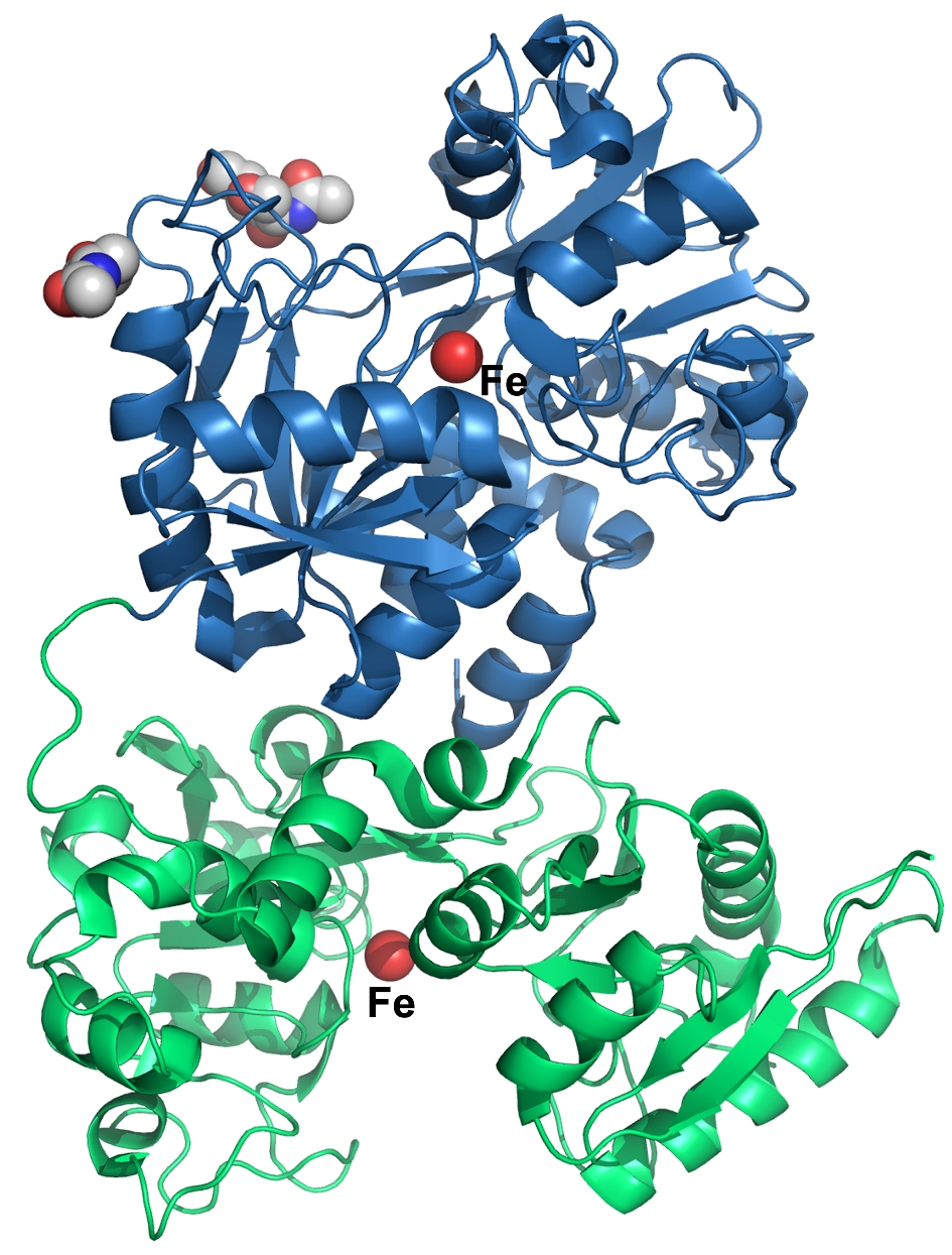 人類運鐵蛋白是人體血漿内含量最高的幾種蛋白之一,可以牢固地結合鐵,並通過一系列機制高效地傳遞至細胞內。長久以來,科學家們都認為鐵的結合,會導致運鐵蛋白的空間結構產生很大變化,使其易於被識別,以便在人體的特定細胞内釋放鐡。港大化學系和生理學系的研究小組近來通過蛋白質晶體學的方法,獲得了兩套結合了鐡的運鐵蛋白晶體結構數據。與以往所獲得的運鐵蛋白「鐡滿載」或「空載」的空間結構不同的是,其中一個新結構,是運鐵蛋白介於上述兩者之間的「中間狀態」。從而證實了運鐵蛋白攜帶金屬鐡到達人體的特定組織後,如同夾子一般緩慢張開並將鐡釋放,是一個連續的動態過程。這也是目前在同類研究中,從結構角度解釋運鐵蛋白形狀變化的最有力證明。