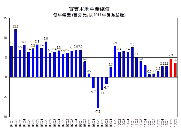 香港大學經濟系教授王于漸指出:「於美國經濟溫和增長的情況下,香港外部需求在2013年上半年已開始逐步復甦。然而,實質本地生產總值增長主要由本地需求所帶動,佔總增長的5.7個百分點;而以貨品及服務出入口淨值計算的外部需求,則拖慢了2.1個百分點。總計,預測本季香港實質本地生產總值增長3.6%。」