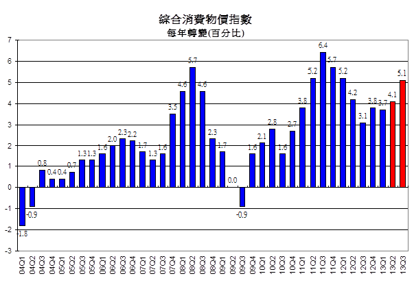 • 以綜合消費物價指數量度,2013年5月一般價格水平上升了3.9%,預料通脹壓力在4%水平變動。整體消費通脹率在2013年第一季增長了3.7%,預料第二季增長4.1%,而第三季則為5.1%。2013年第三季通脹的加速主要由於2012年公屋租金豁免三個月,而2013年公屋租金只豁免兩個月。若扣除所有政府的舒緩措施,通脹率在2013年第三季應為4.3%。