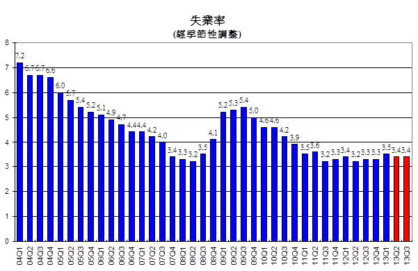 • 經季節性調整的失業率臨時數字由2013年2月至4月的3.5%微跌至2013年3月至5月的3.4%,此期間內職位增加了17,200個。預料失業率在2013年第二季及第三季均為3.4%。估計勞動人口達三百八十七萬人,年增長率為2.0%,本季新增職位的增長維持同一速率。
