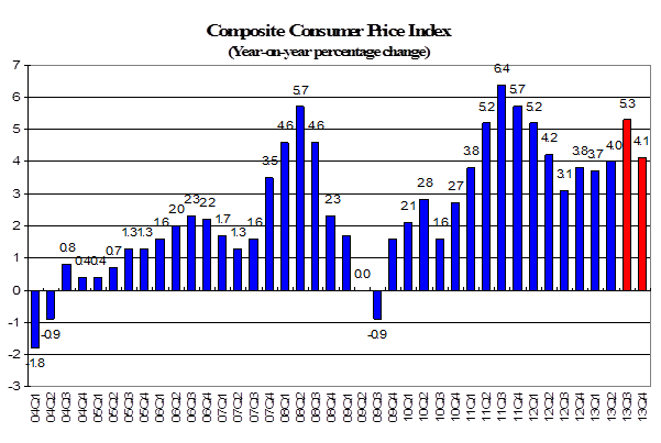 - The general price level, as measured by the Composite CPI, rose by 4.5% in August 2013. The headline consumer inflation rate is estimated to be 5.3% in 13Q3 and after stripping out the effect of the public housing waiver implemented last year, the rate would only be 4.3% in the third quarter. Relative stable in food prices and rentals will cause the price level to stand at around 4.0% in the near term. The consumer inflation rate is forecast to be 4.1% in the current quarter. For year 2013 as a whole, it is estimated to be 4.3%, only a slight increase as compared to the 4.1% inflation rate in 2012.