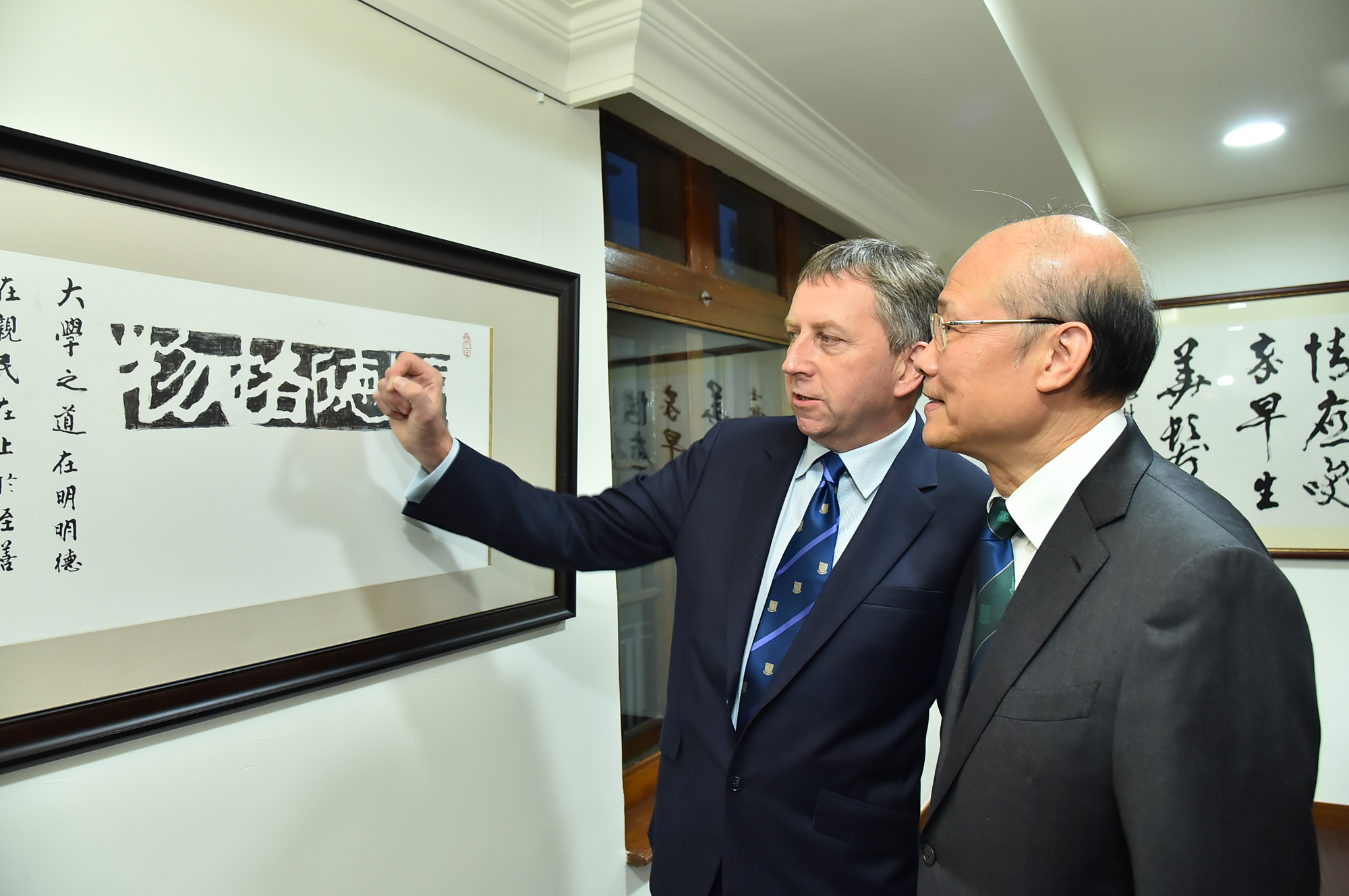 Dr. Ambrose So shows his calligraphic work to Professor Peter Mathieson, President and Vice-Chancellor of HKU