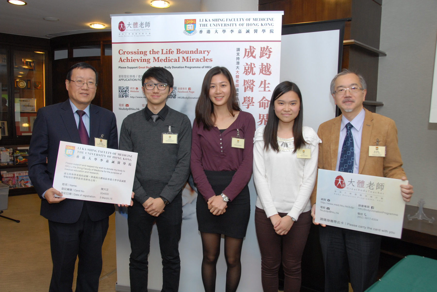 Professor George Tsao Sai-wah (Left 1), Professor and Head of Department of Anatomy, and Dr Chan Lap-ki (Right 1), Associate Professor of Department of Anatomy, Institute of Medical and Health Sciences Education, Li Ka Shing Faculty of Medicine, HKU took a group photo with the medical students, Wong King-nam Edmond (Left 2), Lau Pui-hang Belle (Middle) and Chan Shuk-ling Cathy (Right 2), after the press conference.