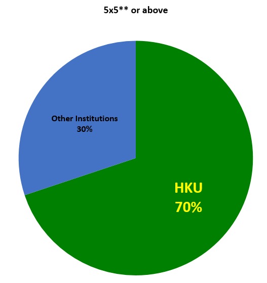 HKU continues to take in by far the largest majority of the territory’s top scorers. Among the 83 students who have obtained 5** in 5 or more HKDSE subjects, 58 (70%) have gained admission to HKU. In particular, the 5 students with 5** in 7 subjects will enroll in two of the most sought-after programmes at HKU – Bachelor of Medicine and Bachelor of Surgery (MBBS), and the Bachelor of Dental Surgery (BDS).