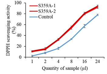 Now, the research group has introduced the S359A into tomatoes, a crop plant. Although there were no differences in the appearance and size of the transformed tomato fruits, total carotenoids including provitamin A and lycopene increased drastically by 169% and 111%, respectively, as observed by a deeper colour of carotenoid extracts in S359A tomatoes over the control (Figure 1). Furthermore, these carotenoid extracts exhibited 89.5-96.5% higher antioxidant activity than the control (Figure 2). Besides carotenoids, the transformed tomatoes displayed elevations in vitamin E (α-tocopherol, 494%), squalene (210%), and phytosterols (94%), as shown in Table 1. These observations were attributed to the increased expression of genes in the isoprenoid pathway.