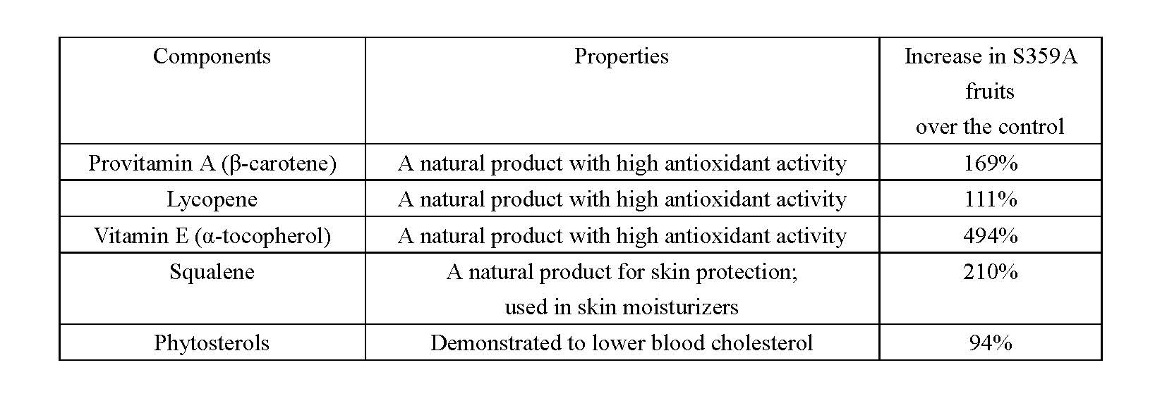 Table 1 Increases in provitamin A, lycopene, vitamin E (α-tocopherol), squalene and phytosterols in S359A-transformed tomato fruits in comparison to the control.