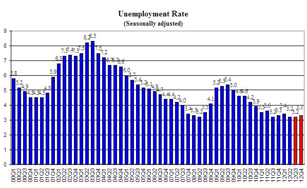 - The provisional seasonally adjusted unemployment rate remained at 3.2% in the 3 months ending in August 2012. Hong Kong's labour force reached an all-time-high level of 3.8 million persons in 12Q3. The unemployment rate is forecast to be 3.2% in 12Q3, and to rise slightly to 3.3% in 12Q4. The labour force is estimated to increase by 7,000 persons with the number of jobs increased only by 3,000, resulting in the number of unemployed going up by 4,000 persons. For the year of 2012 as a whole, the unemployment rate is estimated to average out to be 3.3%.