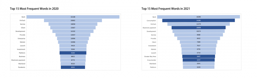 分析往年高達5,000篇新聞報道,2021年的熱門詞可得出包括「消費」、「電子支付」、「大灣區」和「跨境」。而2020年的熱門詞除了「電子支付」還包括「平台」和「疫情」。可見得電子支付仍是金融科技的重點發展領域,其目的為促進大衆消費。