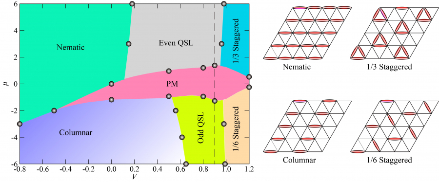 團隊設計了一種新且具有軟約束的三角形晶格量子二聚體模型,使其盡可能接近里德堡原子陣列的實驗條件,並發展了相應的掃描團簇量子蒙特卡洛算法(Sweeping Cluster Algorithm),可以有效地求解這種軟約束的量子多體系統。他們的模擬和理論分析成功地繪製出具有强阻挫和强糾纏效應的Kagome晶格上里德堡陣列的預期物態變化相圖(如圖三所示)。團隊不僅發現了常規的向列固態和交錯固態相和順磁態(paramagnetic phase, PM),而且在相圖中還發現了新奇糾纏量子物態 — 兩種Z2量子自旋液體(quantum spin liquid, QSL)。
