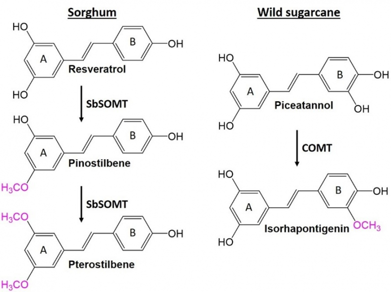 近期有研究顯示,一些植物例如高粱和野生甘蔗,會自行產生不同類型的O-甲基化二苯乙烯類化合物(O-methylated stilbenes),來應對發生在生物體內或受環境因素帶來的威脅。 相比非甲基化二苯乙烯類化合物,這些化合物可能具有更高的保健效果及更容易被人體吸收。因此,利用這類化合物來開發功能性食品、營養保健品和藥物成為一個極具前景的研究領域。