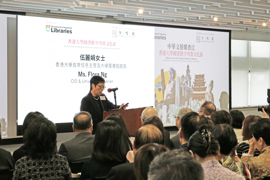 港大首席信息主管及大學圖書館館長伍麗娟女士衷心感謝中央政府及港大支持是次敦煌展覽,由敦煌考察到展覽開幕只有短短三個月作策劃和籌備,整個莫高窟45號以精準1比1複製,是首次在香港展出。感謝敦煌之友Jimmy Lo及李美賢老師,還有敦煌研究院及港大圖書館團隊在籌劃展覽過程中的辛勤付出,更要多謝少雪齋對文化節的慷慨支持,比原來的計劃有十倍增加,這些都是由不可能成變成可能。