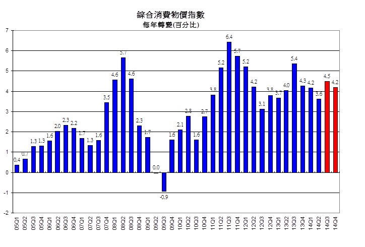 「預料就業市場將輕微惡化,估計失業率由2014年第三季穩定於3.3%,上升至第四季的3.4%。預料整體通脹率會維持穩定,由2014年第三季的4.5%,下跌至第四季的4.2%。」香港大學經濟學首席講師王家富博士補充說。