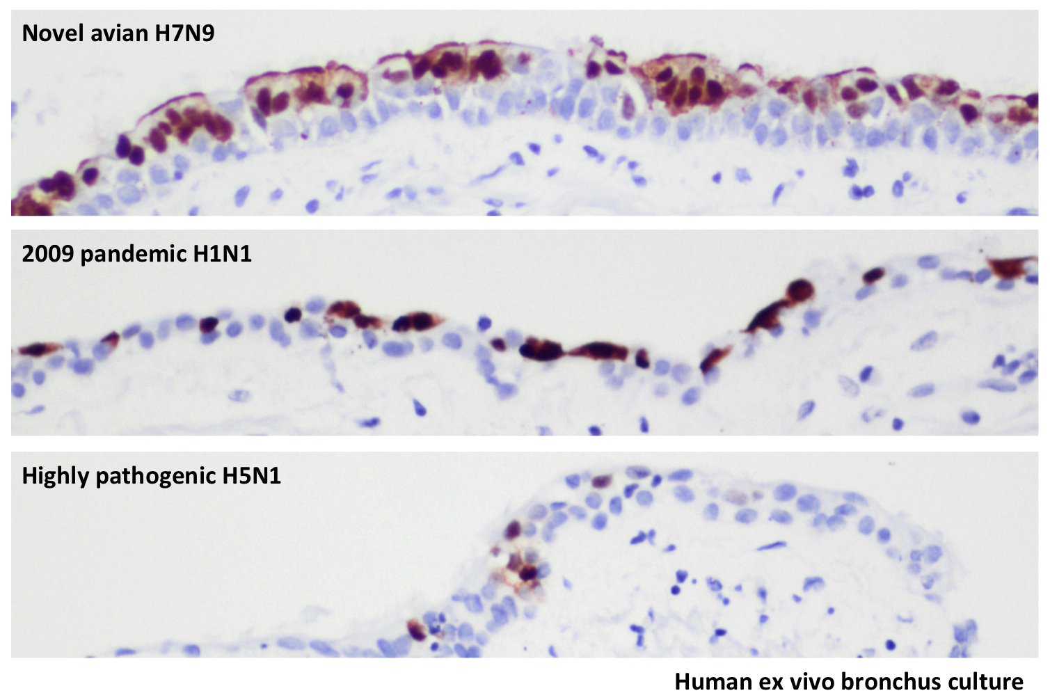 H7N9 virus leads to extensive infection of the surface cells (epithelium) of the bronchus, comparable to the 2009 pandemic virus. In contrast, the H5N1 virus only infects occasional bronchial epithelial (surface) cells.