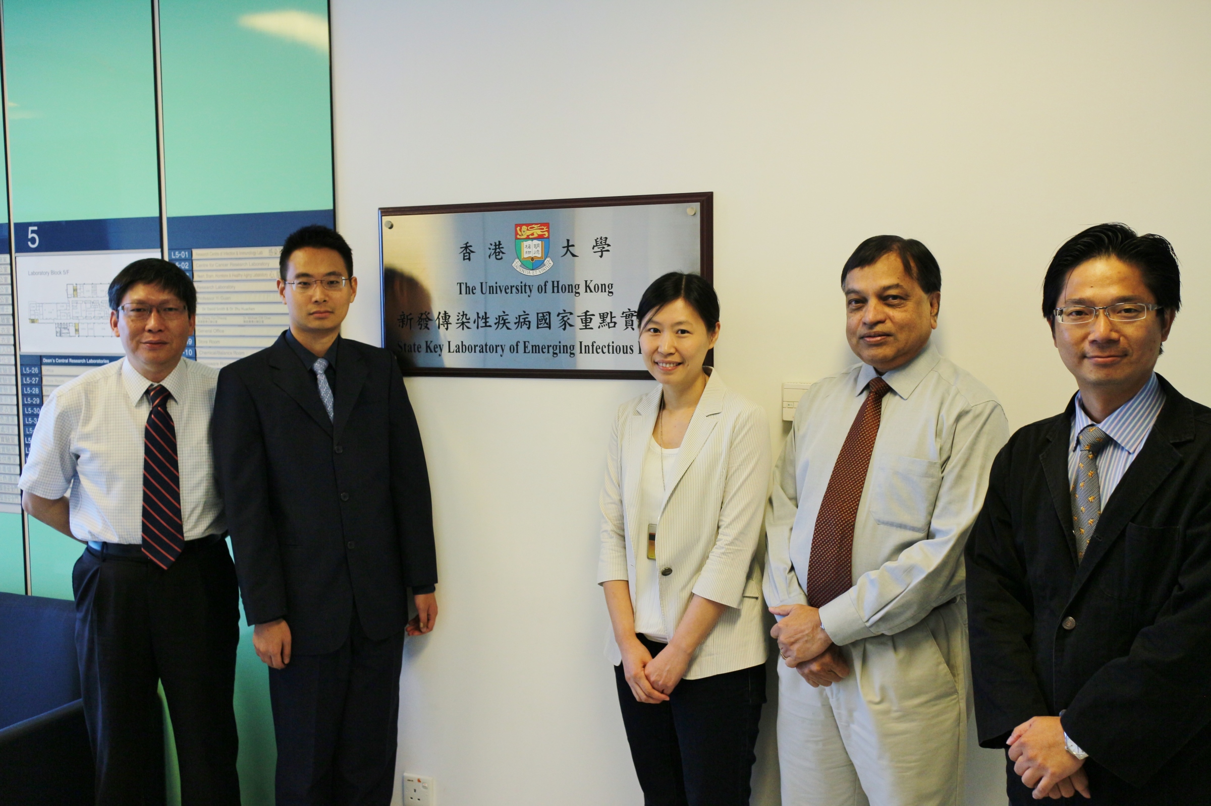 Group photo of the research team at the School of Public Health, Li Ka Shing Faculty of Medicine, The University of Hong Kong. (From Left to Right) Professor Yi Guan, Daniel CK Yu Professor in Virology; Dr Peter Cheung Pak-hang, Research Associate; Dr Yen Hui-ling, Assistant Professor; Professor Malik Peiris, Tam Wah-Ching Professor in Medical Science, Chair Professor of Virology & Director of School of Public Health and Dr Leo Poon, Associate Professor.