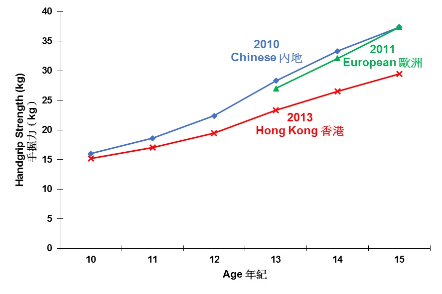 In 2013/14 sy, 173 schools have submitted health and fitness data of about 100,000 students (6 to 19 years) in the platform and our analysis indicated a rather noteworthy picture: about 27% of children participating the Scheme were overweight and obese (Figure 4); the flexibility of an average girl in the Scheme was at the bottom of the Singaporean standard and was below their mainland counterpart’s average (Figure 5); the handgrip strength of our 15 year-old boys was 8.0 kg (27.0%) weaker than their peers in the Mainland China and Europe (Figure 6); and boys’ cardiopulmonary fitness was much worse than those in Europe though the difference among girls was less pronounced (Figure 7). It is particular notable that the physical fitness gap between children participating the scheme and from other parts of the world widened with age.