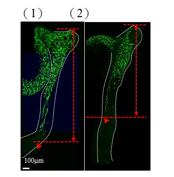 In the figures, neurons are green in color. 1) At the early stage of the development, majority of the gut is colonised by neurons; 2) an obvious delay of gut colonisation was observed in mice with abnormal GLI protein, that mimics the situation of patient with Hirschsprung disease. Red line indicates the distance of gut colonisation.