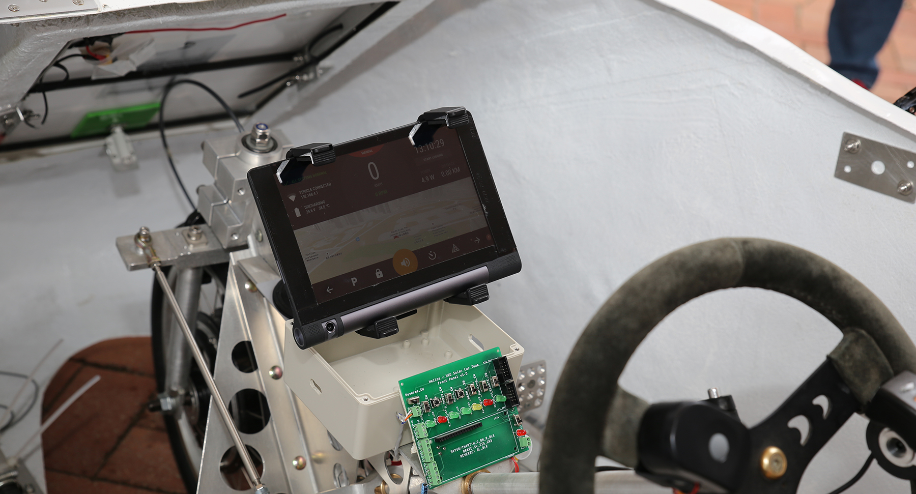 The Vehicle Management Computer, designed by HKU engineering students, serves as the "brain" of the Helios solar car. This computer ensures the safety of the solar car when charging its battery and driving, and also provides real-time data for the touch screen dashboard.