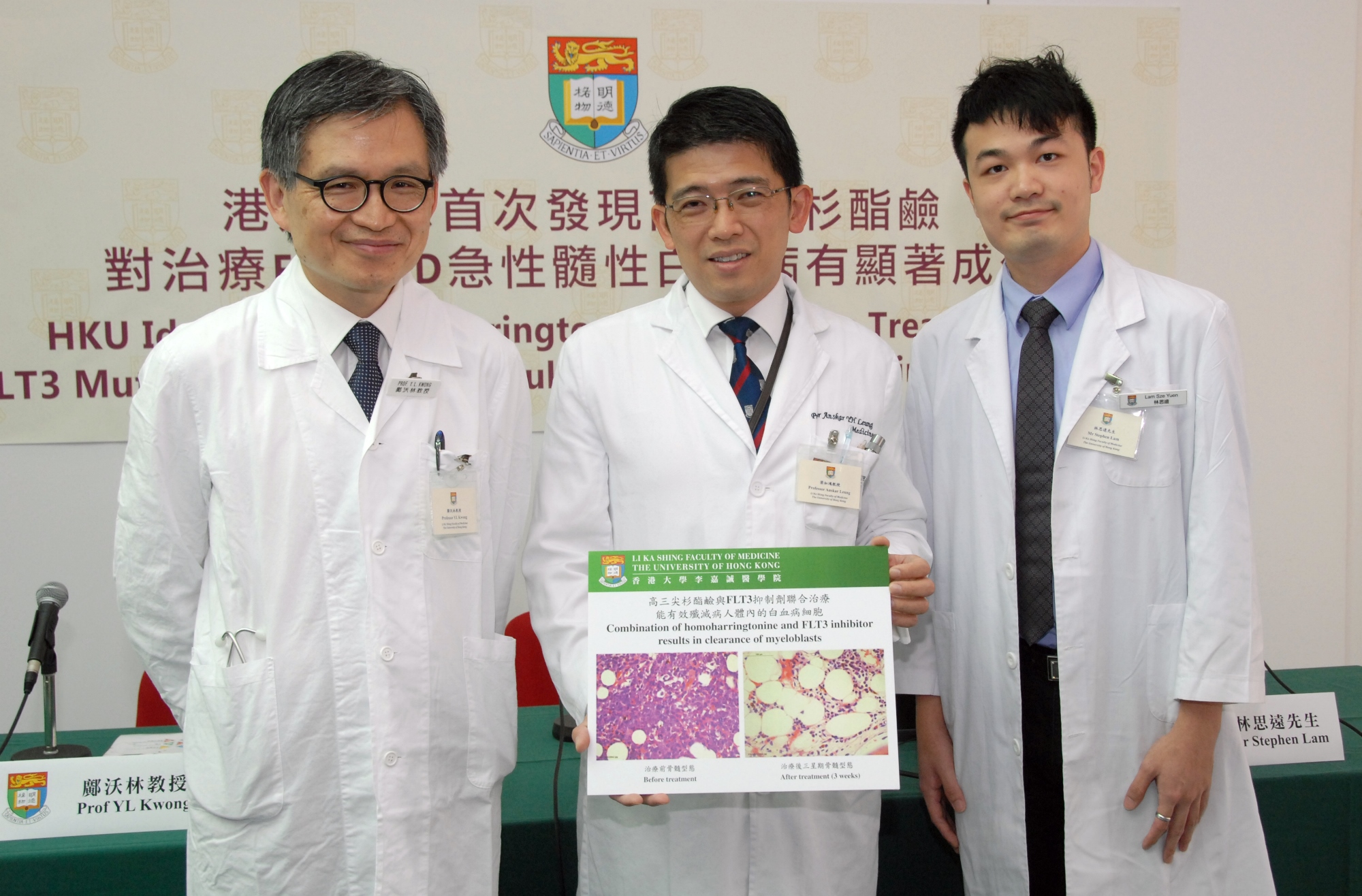 (From left) Professor Kwong Yok-lam, Chui Fook-Chuen Professor in Molecular Medicine, Chair Professor of Haematology and Haematological Oncology of Department of Medicine, Li Ka Shing Faculty of Medicine, HKU; Professor Anskar Leung Yu-hung, Li Shu Fan Medical Foundation Professor in Haematology, Clinical Professor of Department of Medicine, Li Ka Shing Faculty of Medicine, HKU; and Mr Stephen Lam, MBBS / PhD student , Li Ka Shing Faculty of Medicine, HKU.