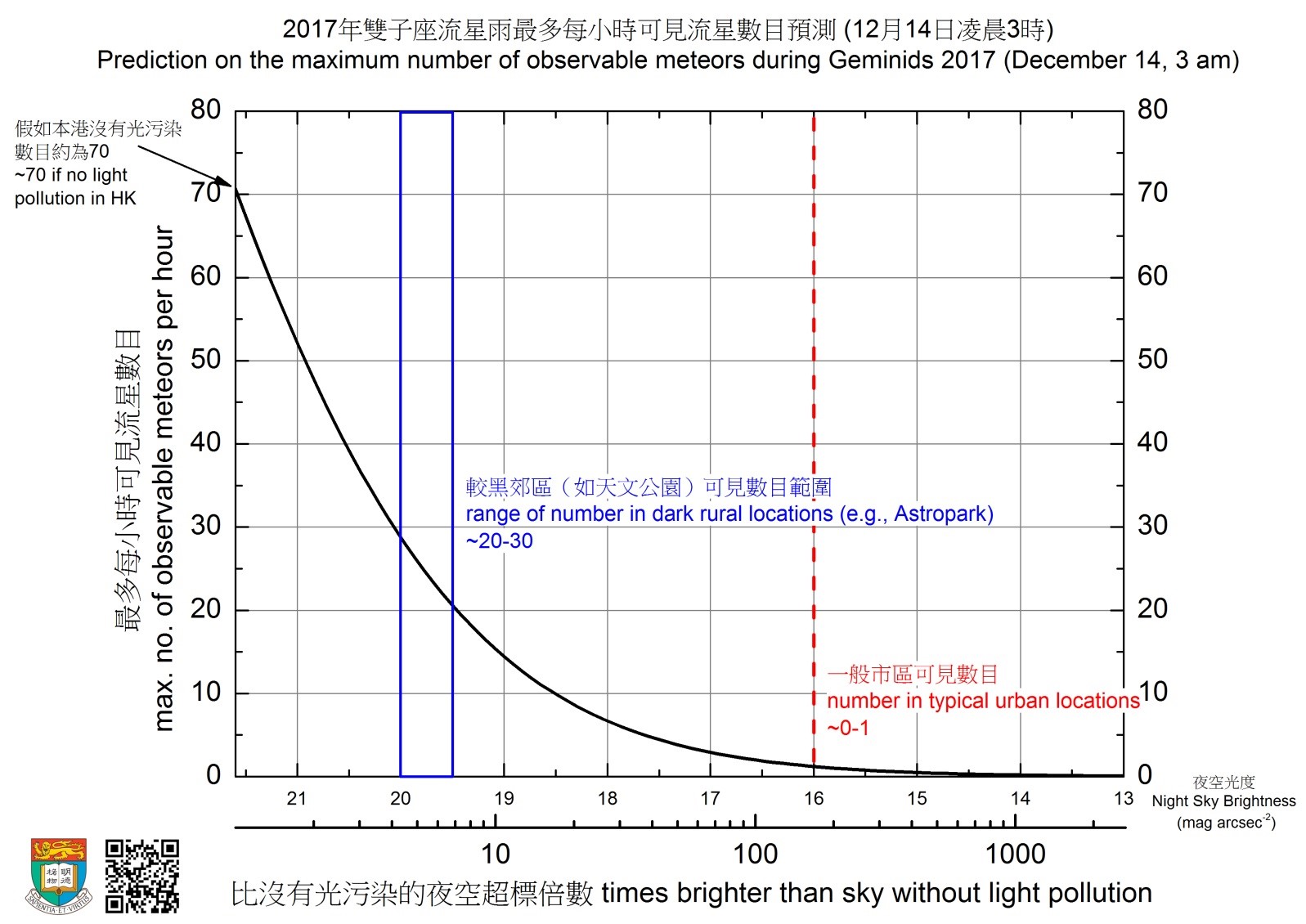 The relation between the number of observable meteors during Geminids 2017 and the light pollution condition of observing site. The plot shows the prediction for December 14, 2017 at 3 am, the best observing time. The number of meteors observable in Hong Kong will be around 70 per hour in a site with no light pollution, but it drops to ~20 - 30 (blue region) for a dark rural location (e.g., Astropark) and further to ~ 0 - 1 for a typical urban location (red). |