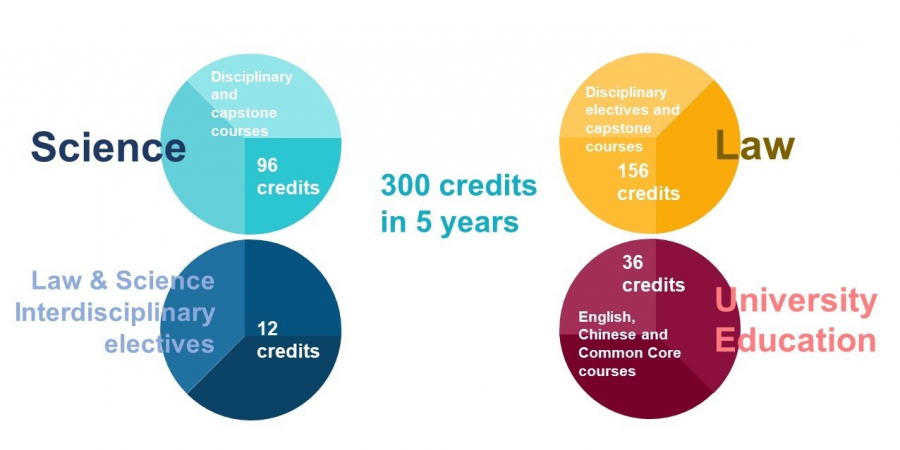 Developed by Faculties of Science and Law in collaboration, this programme integrates scientific and legal expertise coherently. Students will have to study courses from each Faculty, and complete law-and-science interdisciplinary courses as well as capstone experiences for both Science Major and LLB professional core in his or her fourth or fifth year of study. The 300-credit programme comprises:
