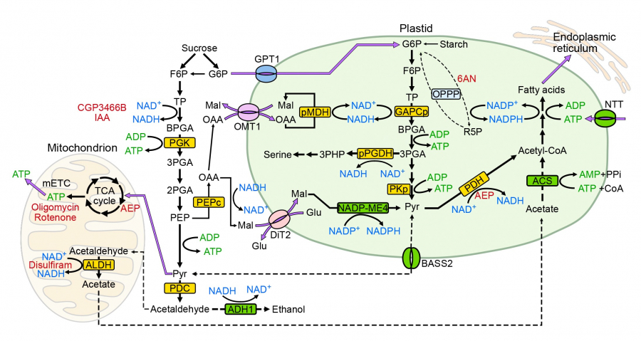 This research not only developed more practical biosensors to measure real-time dynamic changes of ATP, NADPH, NADH/NAD+ in living plant cells and organelles, but also reveals the exact biochemical routes of supplying ATP, NADPH, NADH, and acetyl-CoA for FA synthesis in pollen plastids.