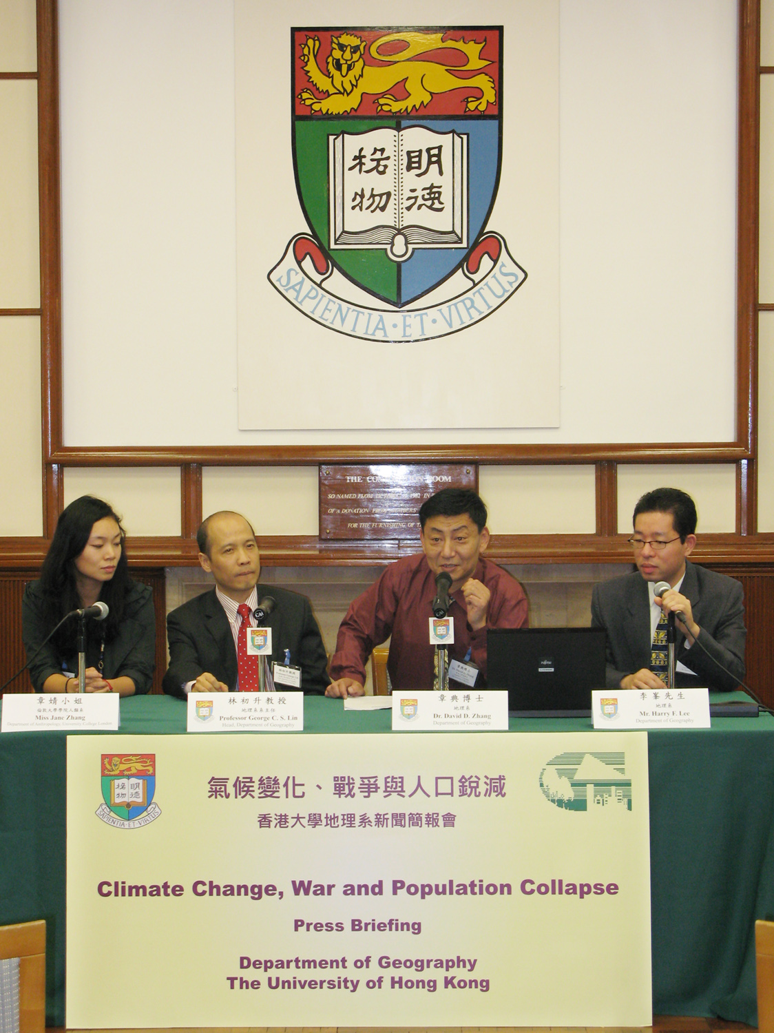 HKU Department of Geography Dr David Zhang and researcher Mr. Harry Lee have in their research concluded that historical war-peace, population and economic cycles are most likely induced by climate change. Major findings of the research are: (1) Cooling induced more wars around the world : Worldwide war ratio in a cold climate was almost doubled that of a mild climate, and similar phenomenon was also observed for the Northern Hemisphere (NH), Asia, arid areas of the NH, and Europe. More than 80% countries and areas around the world had higher war ratios in a cold climate. (2) Cooling induced population collapses around the world: In a mild climate, the population growth rates in various major geographic regions increased; in a cold climate, they shrank together. (3) Cooling engendered disastrous impact on Europe and China synchronously : Europe and China were politically, economically, and geographically detached during the time. However, their socio-economic fluctuations were the same in terms of their macro-trends, turning points, and oscillation magnitude. Besides, those fluctuations were in a successive order and corresponded to the temperature change. It is the first quantitative and scientifically based study in the world in illustrating the impact of climate change on human societies in recent human history at global and continental scales. The research will be published on 4 December 2007 in PNAS (Proceedings of the National Academy of Sciences of the United States of America), the most important journal in Science and Social Sciences in USA. The implications of the research are: (A) Climate change may have played a more important role on human civilization than has so far been suggested. The creditability of many well-known theories regarding historical cycles, wars, and population changes should be re-examined. Firstly, we have satisfactorily explained the parallel occurrence of socio-economic crises in widely separated regions that were in different stages of civilization, culture, and resource endowment. This cannot be achieved by other theories. Secondly, the level of livelihood resources will shrink in some periods due to climate change. This is the root cause of human miseries (e.g., wars, famines and epidemics). This is the point overlooked by Malthus, Darwin, and many other demographers. Thirdly, our research results have explained when, where, and why most of wars occurred. This is also the thing not achieved by other theories. (B) Our research findings are useful in forecasting the impact of global warming on human societies. The 'recent global warming' and 'past cooling' are both climatic extremes. The last 10-year is the hottest period over the last two millennia. The speed of global warming is totally beyond our imagination. Such abnormal climate will certainly break the balance of human ecosystem. At the moment, scientists cannot accurately predict the chain ecological effects induced by climate change. If global warming continues, we afraid that the associated shortages of livelihood resources such as fresh water, arable land, and food may trigger more armed conflicts (e.g., Darfur in Africa) or even general crises in the world. The article to be published on 4 December in PNAS (Proceedings of the National Academy of Sciences of the United States of America) : "Global climate change, war and population decline in recent human history" by David D. Zhang, Peter Brecke, Harry F. Lee, Yuan-Qing He and Jane Zhang. For media enquires, please contact HKU Department of Geography Dr. David Zhang (mobile: 9559 8533), researcher Mr. Harry Lee (mobile: 96547650) or HKU Senior Manager (Media) Ms. Cherry Cheung (mobile: 8208 1686 / email: cherry.cheung@hku.hk)