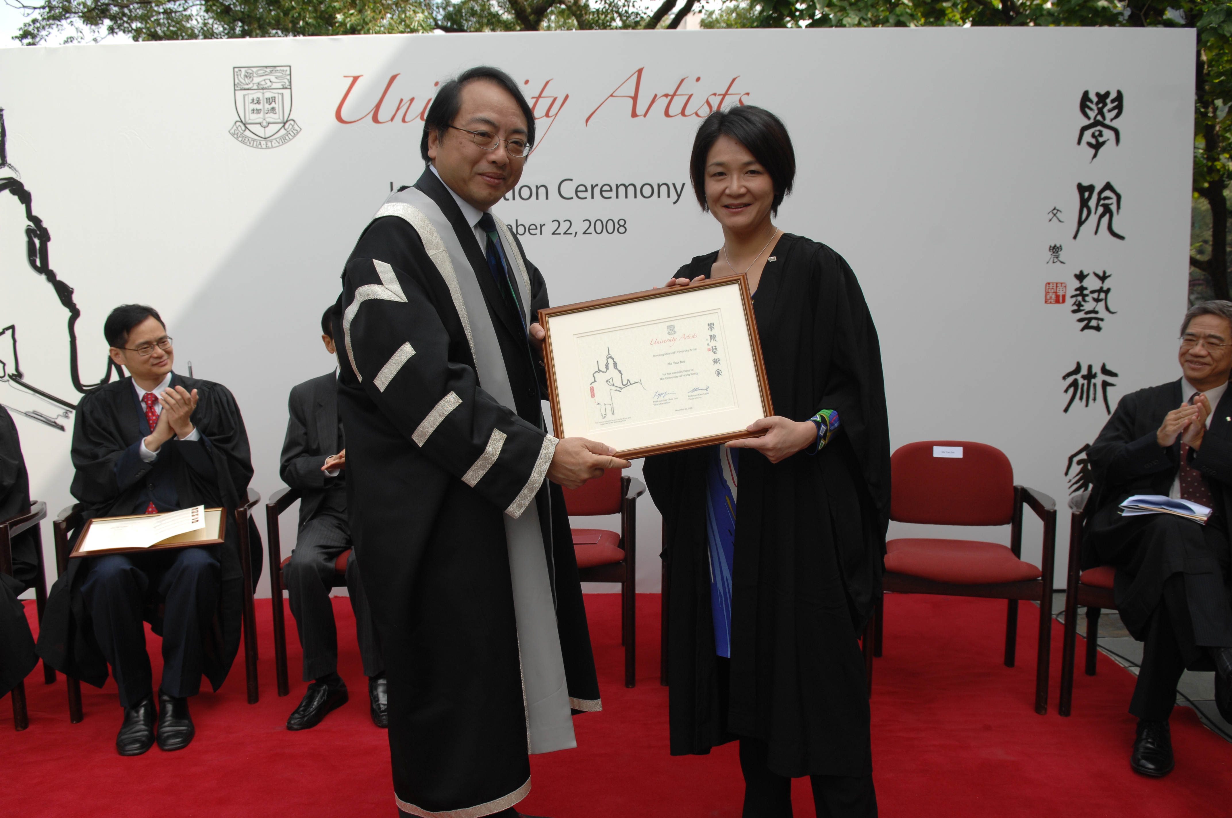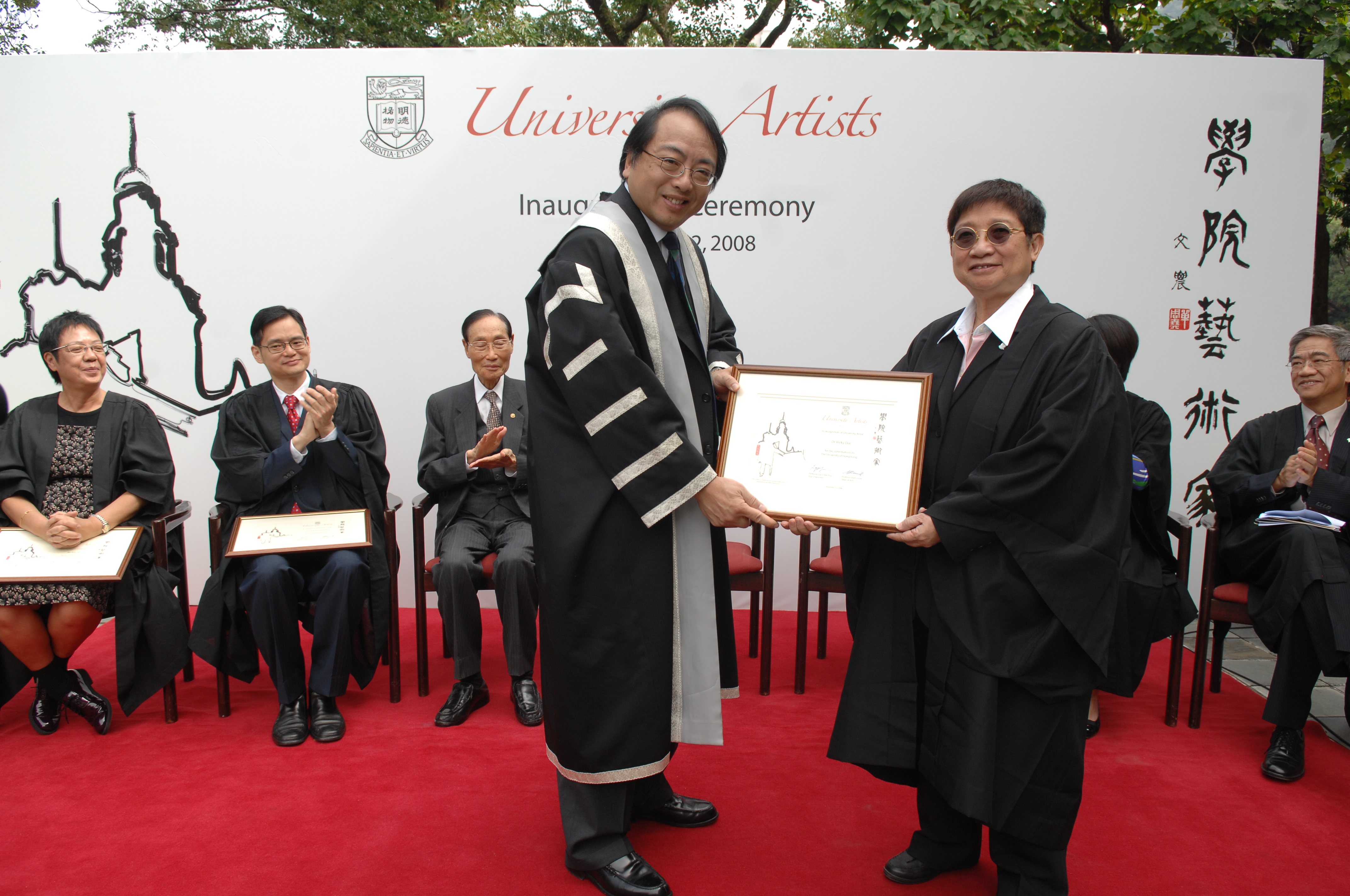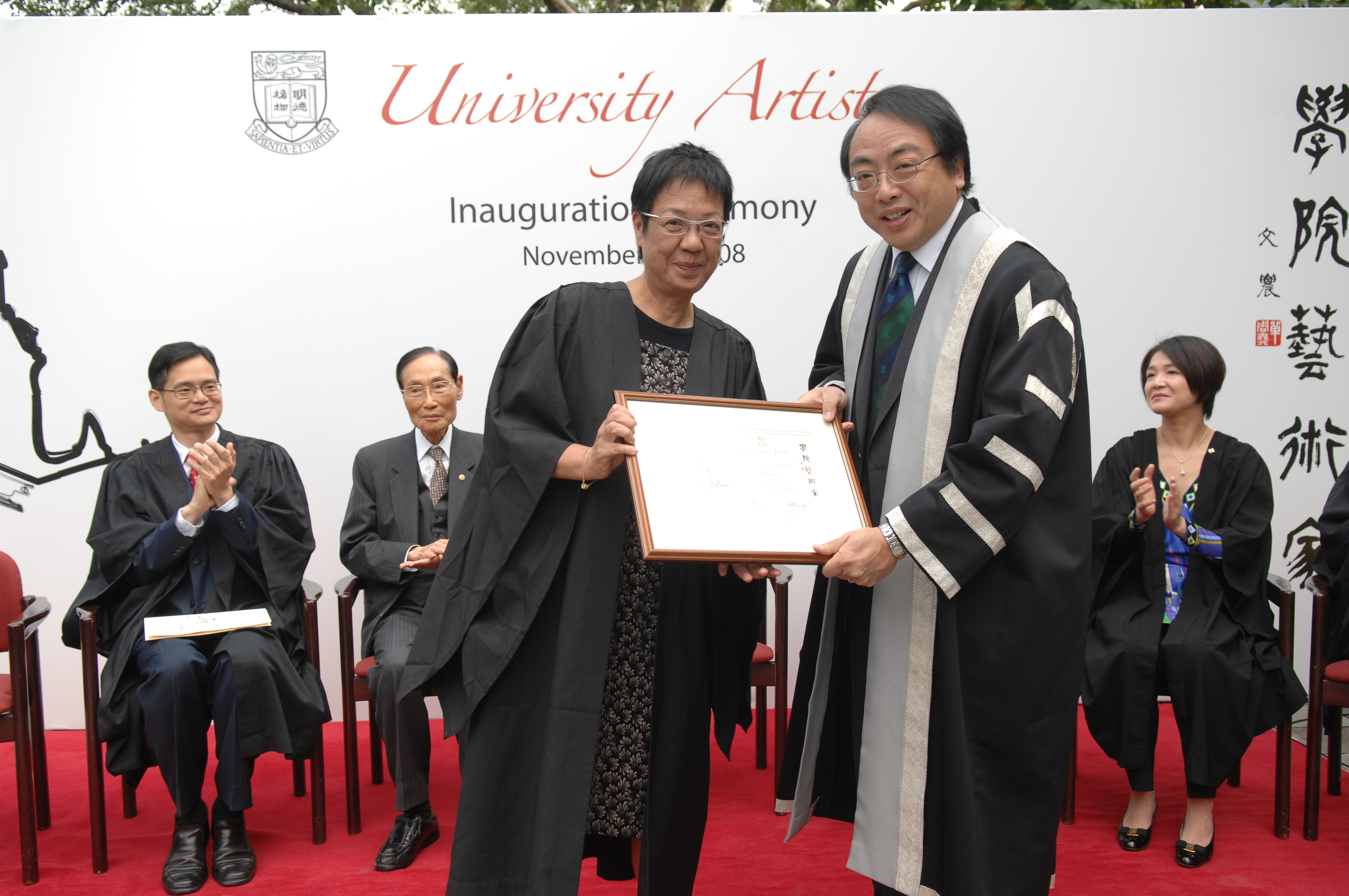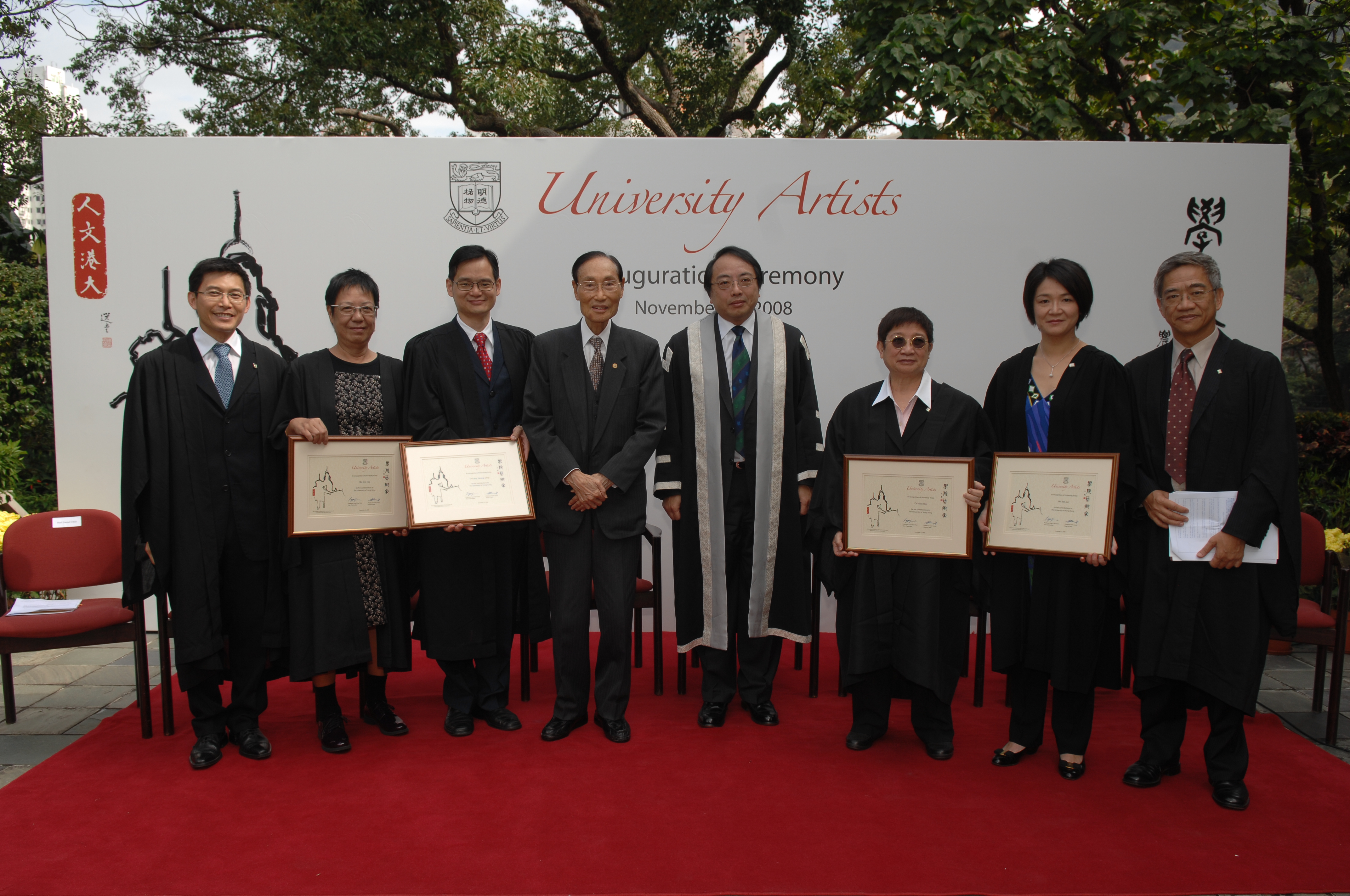 The University of Hong Kong (HKU) launched the University Artists Scheme (the Scheme) in an inauguration ceremony today. The Scheme focuses on artists of an international caliber. Five renowned artists from the Drama, Film and Music disciplines were appointed as University Artists for 2008 - 2010. They are Mr Peter Ho-sun Chan (Filmmaker), Ms Ann On-wah Hui (Filmmaker), Ms Jue Yao (Violinist), Dr Heung-wing Lung (Percussionist) and Dr Vicki Ooi (Drama Educator /Theatre Director). The scheme is hosted by the Faculty of Arts and supported by the Wah Ching Fund. The inauguration ceremony was officiated by HKU Vice-Chancellor Professor Lap-Chee Tsui in the presence of Dean of Arts Professor Kam Louie, Head of School of Humanities Prof. Daniel Chua and various guests.