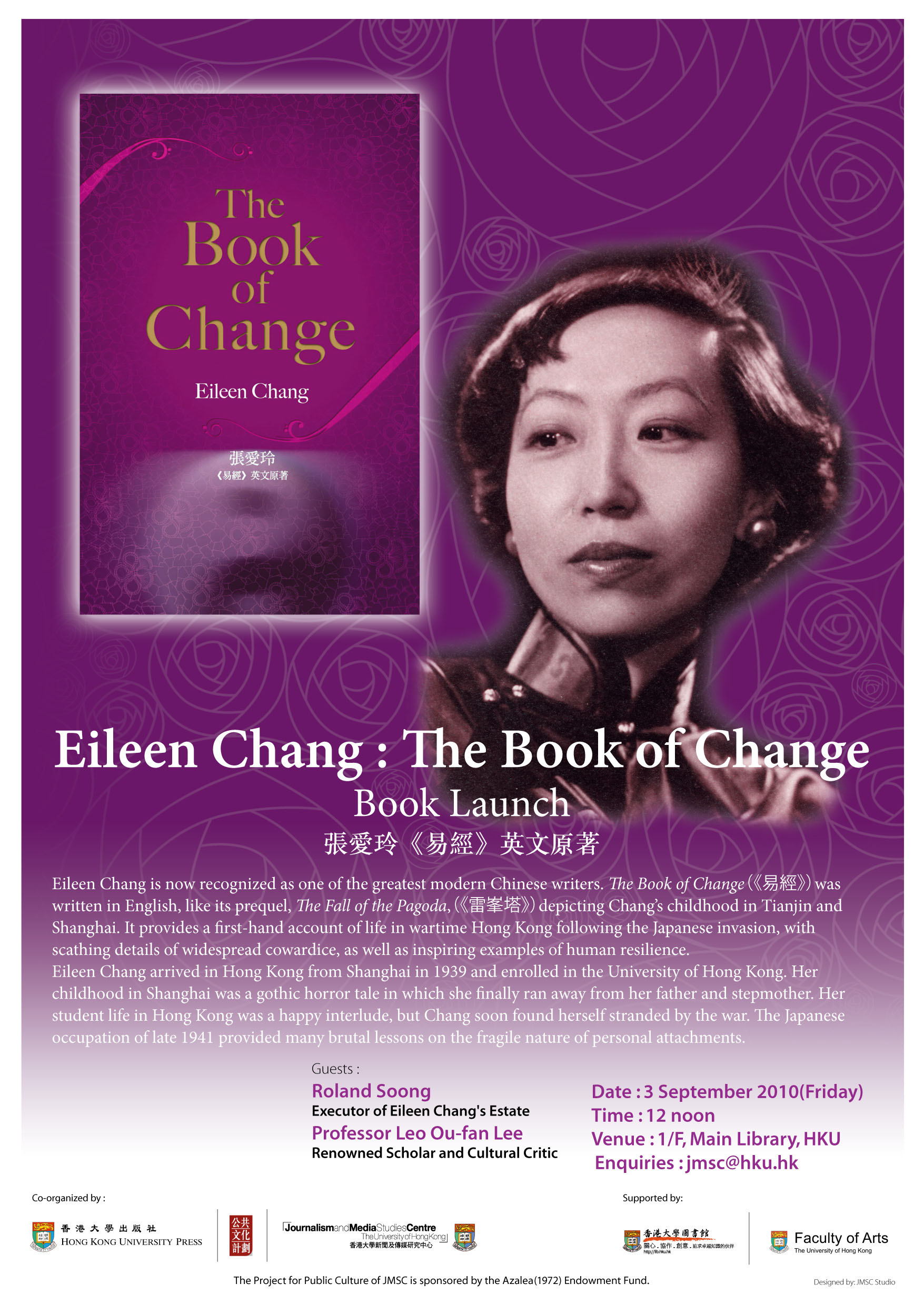 The Hong Kong University Press and University's Project for Public Culture of Journalism and Media Studies Centre (JMSC) will co-host a book launch for a noted contemporary Chinese writer, Eileen Chang's (1920-1995) semi-autobiographical novel The Book of Change《易經》on 3 September 2010. The book launch also marks the 90th birthday and 15th anniversary of Chang's death.