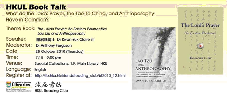 Saying the Lord's Prayer is a daily ritual for many believers and the Tao Te Ching is a popular classic in both the East and the West. A self-taught scholar in religion and philosophy, Professor Sit will introduce Anthroposophy, a study of spirituality founded by the Austrian philosopher Rudolf Steiner (1861-1925) . She will share her personal perception and practical insights of the common teachings of the three, which are explored in her first book on the Lord's Prayer, and her forthcoming book on Lao Tzu and Anthroposophy.