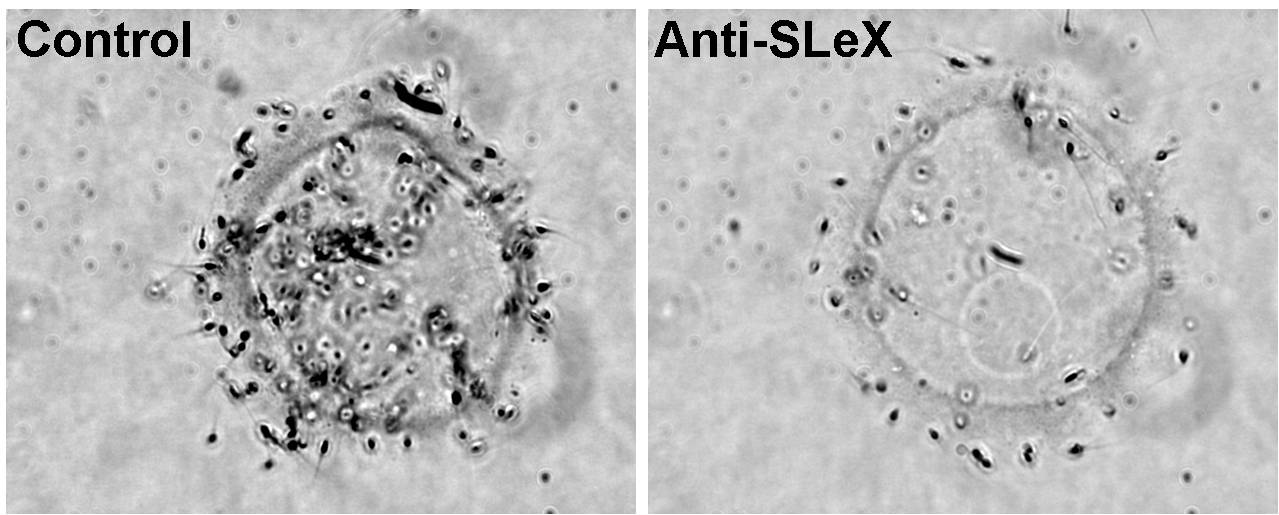 functional analyses of SLeX and showed that specific antibody against SLeX or exogenous SLeX can suppress sperm-ZP binding by 70-80%. Consistently, alteration of the SLeX structure reduced the binding of sperm to ZP. The results demonstrated that SLeX is the key molecule for human sperm-egg binding.