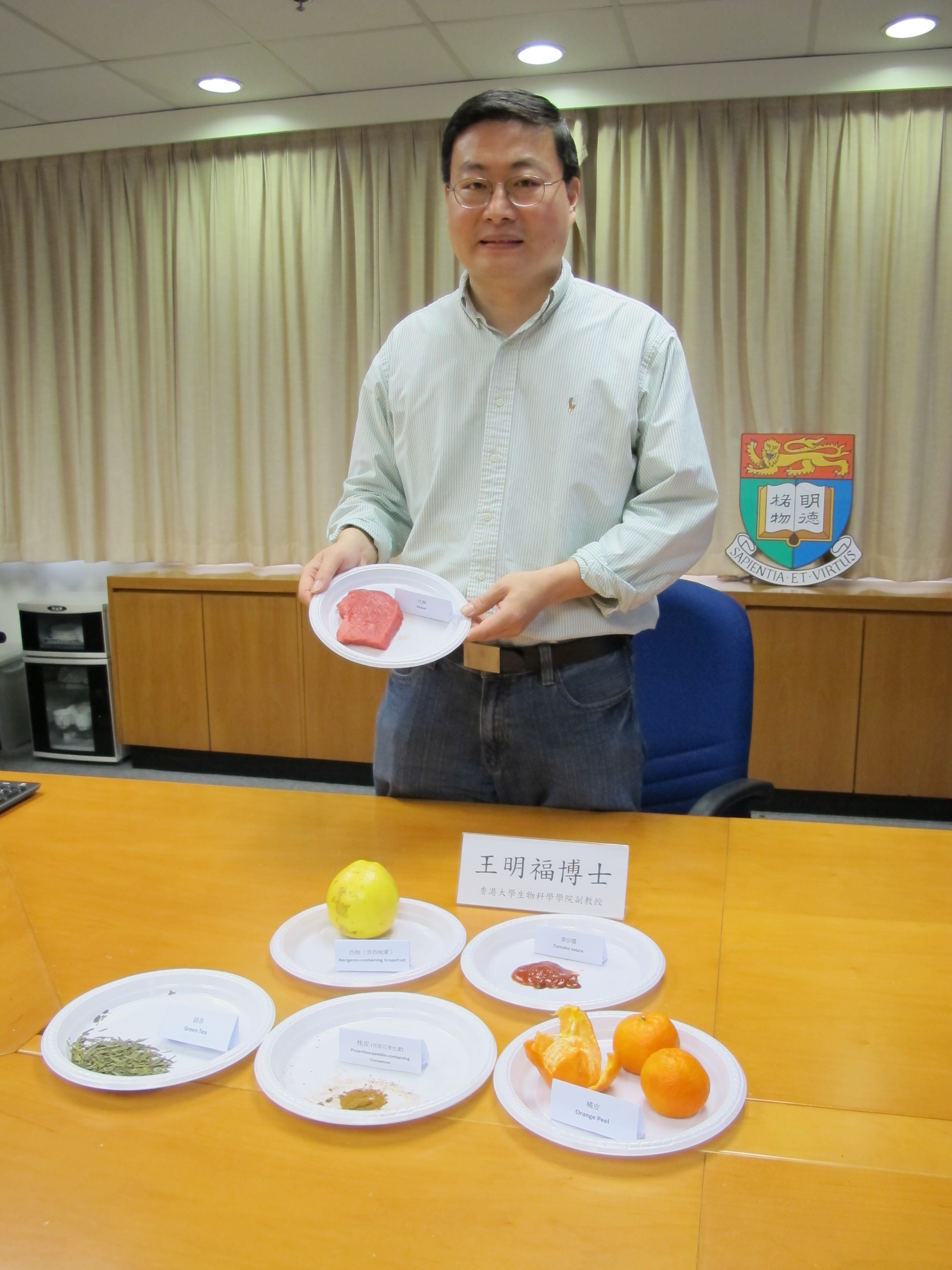 A recent study of the University of Hong Kong discovered that selective use of natural condiments as meat seasoning can significantly reduce the formation of carcinogenic substances formed in high-temperature heating process. Together with appropriate cooking method, some novel food components that help prevent cancer can also be formed. Dr Ming-fu Wang, Associate Professor of the School of Biological Sciences who led the research team, is presented with the University Outstanding Young Researcher Award 2012 for his exceptional achievements in the research area.
