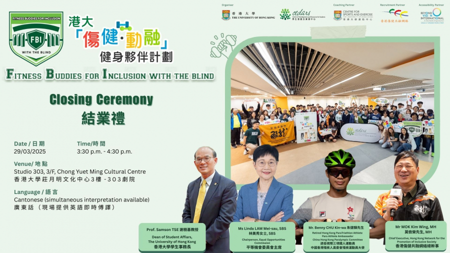 The University of Hong Kong (HKU) will host the Closing Ceremony of the Fitness Buddies for Inclusion (FBI) with the Blind Programme, an innovative initiative proudly organised by the Centre of Development and Resources for Students (CEDARS) in collaboration with Centre For Sports and Exercise (CSE), Hong Kong Network for the Promotion of Inclusive Society (HKNPIS) and Beyond Vision International (BVI).