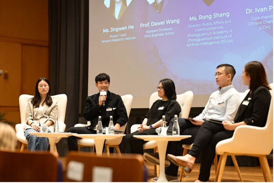 From right: Ms. Bernice YU, Head of Operations of HKU Jockey Club Enterprise Sustainability Global Research Institute; Dr. Ivan POON, core member at Climate Change AI (CCAI); Ms. Rong SHANG, Director, Public Affairs and Communications, Zhongguancun Academy X Zhongguancun Institute of Artificial Intelligence (ZGCAI); Prof. Dawei WANG, Assistant Professor, HKU Business School; and Ms. Jingwen HE, Project Manager, Tencent Research Institute, joined the Roundtable Dialogue on AI for Sustainability.